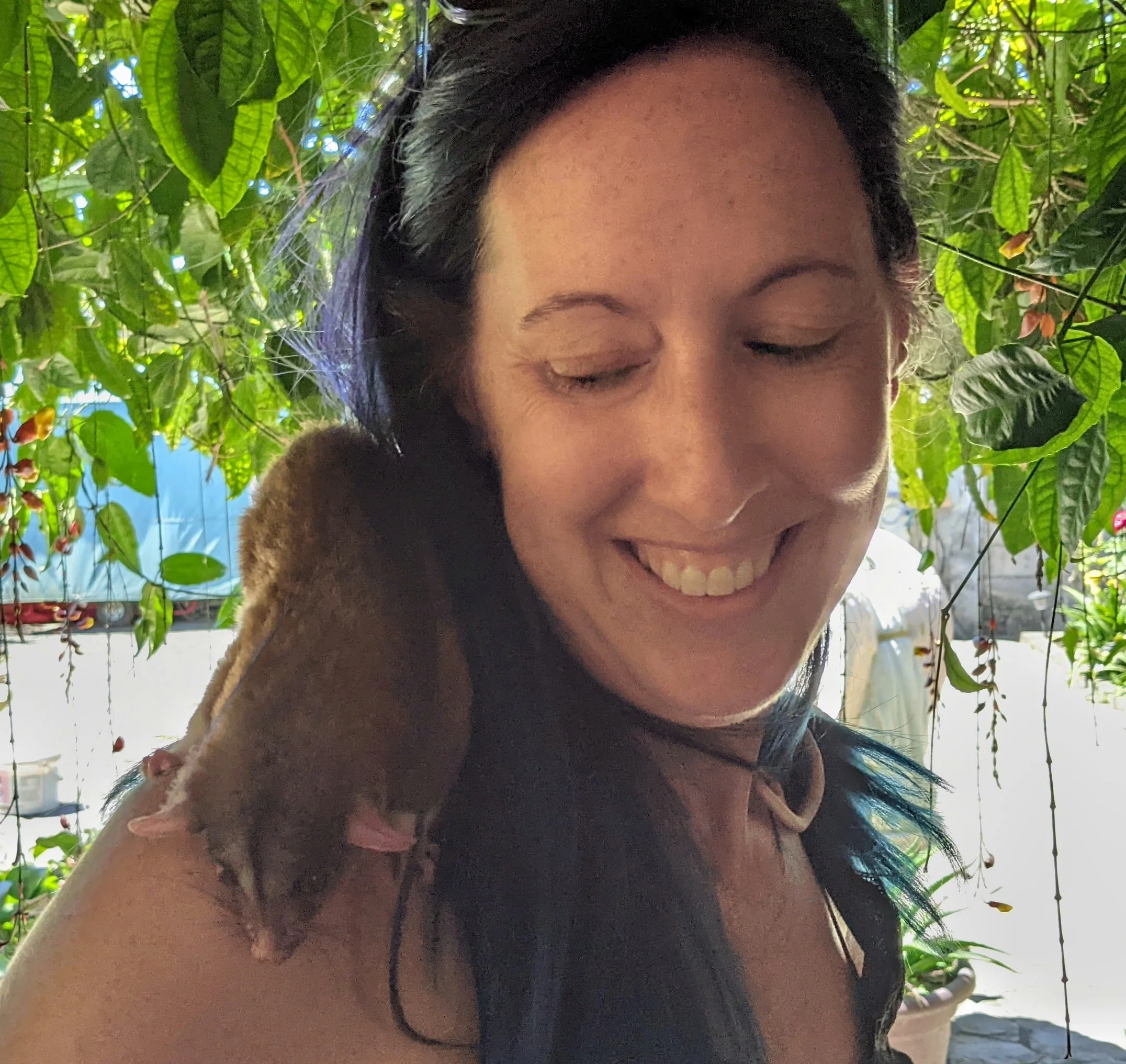 Raquel is an ex-pat that provides a home and rehabilitation for wild animals. When we visited she had a sloth, wooly opposum, coatimundi, jaguar, squirrel monkey, and capuchin monkeys. The sloth has been in her care for twelve years and was adorable… but those teeth! We fed him flowers and watermelon, but he was more interested in trying a taste of my arm! I fear I have been infected with a bit of sloth pereza (laziness). I do love that the spanish name for sloth (perezoso) translates to lazy!